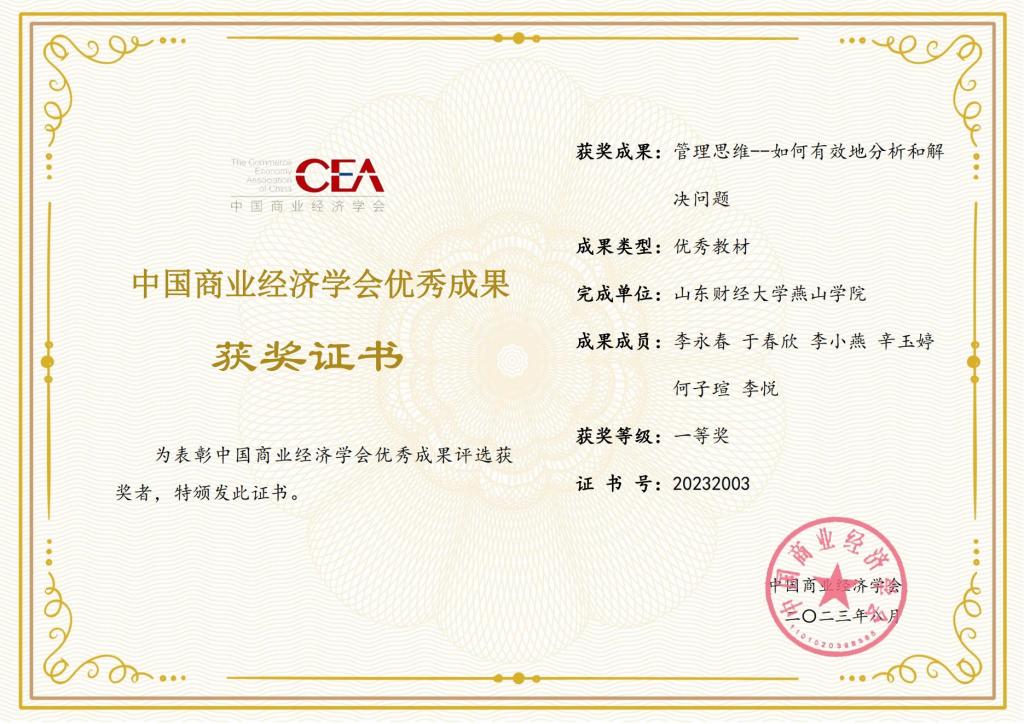 在剛剛結(jié)束的中國商業(yè)經(jīng)濟學會2023年度優(yōu)秀成果評獎活動中,由6776永利集團院長李永春教授主編的教材《管理思維---如何有效地分析和解決問題》榮獲優(yōu)秀教材一等獎。同時,在8月份進行的山東省第十五屆大學生科技節(jié)活動中,6776永利集團李永春、劉金煒指導(dǎo)的學生組榮獲山東省大學生智慧企業(yè)管理創(chuàng)新設(shè)計大賽數(shù)字商業(yè)企業(yè)模擬經(jīng)營對抗賽道一等獎。另外,在前不久公布的山東省教育科學研究院組織的2023年度山東省教育教學研究課題...